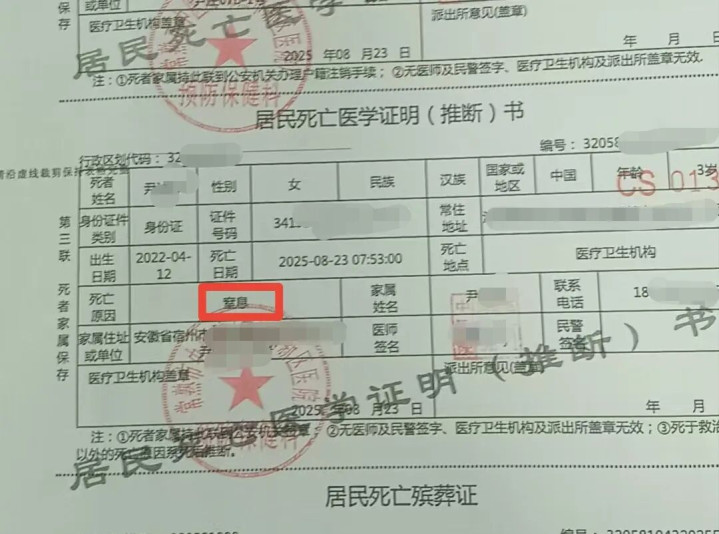 尹先生提供的死亡医学证明显示,其女儿直接死亡原因为窒息。