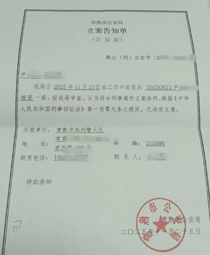 案发3个月后的2025年11月25日,常熟市公安局决定刑事立案,邱某被警方控制。立案告知单显示:“尹某某被害一案,经审查,认为符合刑事案件立案条件,已决定立案。”办案单位为常熟市局刑警大队。